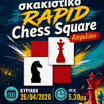 Tην ερχόμενη Κυριακή 22 Μαρτίου, στις 5.30 το απόγευμα, θα γίνει το Παιδικό-Νεανικό Rapid Chess Square Μαρτίου 2026, τουρνουά προετοιμασίας για τα μαθητικά πρωταθλήματα Αττικής. Επαθλα: 1ος νικητής: ΚΥΠΕΛΛΟ Θα απονεμηθούν επίσης μετάλλια: α) Στα 3 πρώτα παιδιά γενικής κατάταξης β) Στα 3 πρώτα κορίτσια γ) Στο πρώτο παιδί κάτω των 18 (γεννηθέν από το 2008 και μετά) […]